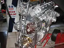 The Offenhauser engine, familiarly known as the "Offy", was an overhead cam monoblock 4-stroke internal combustion engine developed by Fred Offenhauser and Harry Arminius Miller.[4] Originally, it was sold as a marine engine. In 1930 a four-cylinder 151 cu in (2.47 L) Miller engine installed in a race car set a new international land speed record of 144.895 mph (233.186 km/h). Miller developed this engine into a twin overhead cam, four-cylinder, four-valve-per-cylinder 220 cu in (3.6 L) racing engine. Variations of this design were used in midgets and sprints into the 1960s,[5] with a choice of carburetion or Hilborn fuel injection.[6] When both Miller and the company to whom he had sold much of the equipment and rights went bankrupt in 1933, Offenhauser opened a shop a block away and bought rights to engines, special tooling and drawings at the bankruptcy auction, and he and other former Miller employees took over production. They and former Miller employee, draftsman Leo Goossen, further developed the Miller engines into the Offenhauser engines.