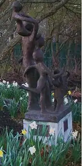 The Water Garden sits to the north of the patio and consists of 6 pools with 2 large urns in the corners to recirculate the water. The water garden features a diverse collection of aquatic plants. The Black Swamp Garden is located to the east of the patio, and above this is a crab apple grove with the sculpture named To Life. This sculpture by Alfred Tibor depicts a father with a child on his shoulders, a mother, and two children playing around them.