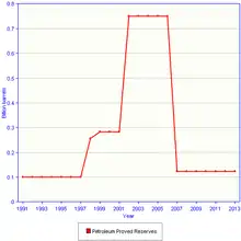 A 2004 partnership between Spanish oil company Repsol-YPF and Cuba's state oil company Cupet estimated Cuba's off-shore reserves to be able to ultimately produce between 4.6 and 9.3 billion barrels of crude oil.[3] Also in 2004, the U.S. Geological Survey estimated that the North Cuba Basin had a 95% probability of having at least 1.1 billion barrels, and a 5% chance of having 9.4 billion barrels; the most likely volume was 4.6 billion barrels of undiscovered oil.[4]