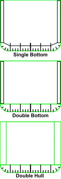 A major component of tanker architecture is the design of the hull or outer structure. A tanker with a single outer shell between the product and the ocean is said to be "single-hulled".[81] Most newer tankers are "double hulled", with an extra space between the hull and the storage tanks.[81] Hybrid designs such as "double-bottom" and "double-sided" combine aspects of single and double-hull designs.[81] All single-hulled tankers around the world will be phased out by 2026, in accordance with the International Convention for the Prevention of Pollution from Ships, 1973 (MARPOL).[81] The United Nations has decided to phase out single hull oil tankers by 2010.[82]