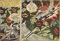 During the late 1950s and early 1960s a number of American painters began to adapt the imagery and motifs of comic strips. Lichtenstein made drawings of comic strip characters in 1958. Andy Warhol produced his earliest paintings using this style in 1960. Lichtenstein, unaware of Warhol's work, produced Look Mickey and Popeye in 1961.[1] Soon, Lichtenstein advanced from animated cartoons to more serious themes such as romance and combat depictions.[2] Lichtenstein said that at the time, "I was very excited about, and very interested in, the highly emotional content yet detached impersonal handling of love, hate, war, etc., in these cartoon images."[2] The work was inspired by five different comic book panels made by Russ Heath and Irv Novick.[3] The plane, the pilot, the text balloon and the graphic onomatopoeia, "VOOMP!", all come from panels from different comic books.[4]