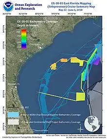 The first leg of this expedition took place from May 22 to June 6 and involved the collection of seafloor and water column mapping data to further improve fundamental understanding in this region and to facilitate remotely operated vehicle (ROV) dive planning. Mapping operations were focused offshore Florida, Georgia, and South Carolina, in the South Atlantic Bight - and more specifically, the Blake Plateau - over some of the least explored ares along the East Coast of the United States. During the mission, the team mapped over 4,900 linear kilometers, resulting in complete seafloor bathymetric coverage of over 16,000 square kilometers- an area larger than the states of Connecticut and Rhode Island combined, or nearly the size of Lake Ontario. ROV dives were conducted from July 14 to July 1 during the expedition's second leg.[8][9]