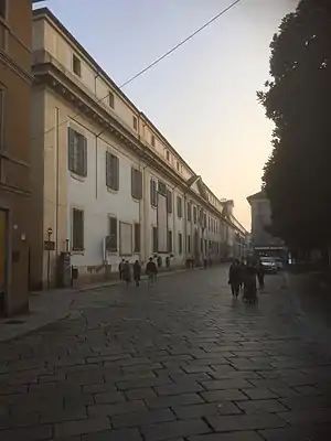 The University of Pavia was founded in 1360,[1] but for a long time the lessons took place in different places, such as in the rooms of the Dominican monastery of San Tommaso, in private homes or in the broletto, only between 1485 and 1490 Ludovico il Moro decided to donate to the university, the only one of the duchy of Milan and in great growth in those years, the palace of Azzone Visconti which was located along Strada Nuova, near the San Matteo hospital.[2] The building was renovated in 1534 and during these works two courtyards with arcades and loggias were created, one intended for students of civil and canon law called "Legal" and the second, originally called "Doctor" along which the classrooms overlooked which housed the teachings of medicine, philosophy and liberal arts.[3]