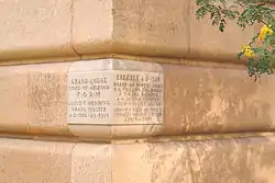 With the building half completed, the city and county hosted a dedication ceremony conducted by the Arizona Grand Lodge of Masons. Among the dignitaries present were Senator Carl Hayden, the acting Grand Orator, and Col. John Philip Sousa, conducting the Marine Corps Band.[2] At the ceremony, the cornerstone of Arizona granite was laid, and a time capsule, coated in copper and containing documents, emblems and other ephemera, was mortared inside with a silver trowel.