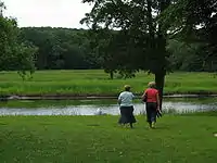 The town of Lyme was set off from Saybrook (now known as Deep River), which is on the west bank of the Connecticut River mouth, on February 13, 1665. South Lyme was incorporated from Lyme in 1855, then renamed Old Lyme in 1857, because it contains the oldest-settled portion of the Lymes.[2] Old Lyme occupies about 27 square miles (70 km2) of shoreline, tidal marsh, inland wetlands, and forested hills. Its neighbor to the north is the town of Lyme, and to the east is East Lyme. Other place names from the same root are Hadlyme, a neighborhood in the town of Lyme and the town of East Haddam, and South Lyme, a beach resort area of Old Lyme. The place name "Lyme" is derived from Lyme Regis, a small port on the coast of Dorset, England from which some of the early settlers immigrated in the 17th century.[3] The picturesque Old Lyme Cemetery contains the graves of the settlers. The Duck River flows through the cemetery and into the Connecticut River at Watch Rock Park.
