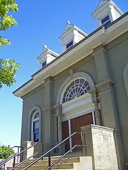 On the inside, the ground level is of stripped maple with sheet-iron walls and ceiling supported by two rows of cast iron columns. A large metal vault is located under the main stairs, which lead to the auditorium. That takes up two stories leading up to an exposed wooden truss ceiling. The three dormers provide light to the balcony level behind them.[1]