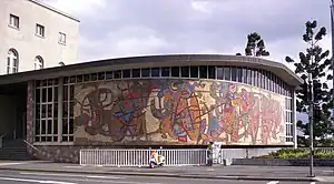 In 1958 national competitions were held for designs for a wall mural and sculpture to embellish the exterior of the new Centennial Hall. These were won by Victorian artist Lindsay Edward[5] for his glass mosaic mural, and Brisbane sculptor Leonard George Shillam. Shillam's aluminium sculpture 'Enlightenment' showed three symbolic figures reaching towards the rays of the sun, representing 'the dissemination of enlightenment to mankind - the function of a library as an instrument of enlightenment'.[6][7] It was cast by the Non-Ferrous Foundry of Brisbane.[1]