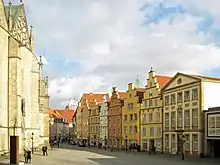 The church is located just next to the town hall on the market place. In 1543 the church was changed to a Protestant church. From 800 to 850 the church was most likely just used for funerals. In the 13th century to the 15th century the church was extended with to more side aisles and a vault for the choir. But the most impressive is the exterior view. Northern- and southern side are symmetrical designed with four high Gothic windows on each side and four gables. On these gables are statues that are made of sandstone positioned. Between these statues are also gargoyles in the shape of fantasied animals. Moreover, many statues are positioned besides the four big portals.[8]