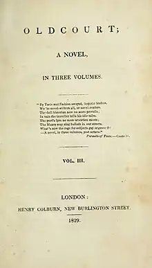 Oldcourt is an 1829 novel by the Irish writer Martin Archer Shee, originally published in three volumes.[1] Archer Shee is better known as a painter, and was the following year elected President of the Royal Academy in London, but he also published poetry, two novels and a play. It was published by Henry Colburn of New Burlington Street in London. It takes place around Oldcourt Castle, in Ireland, and depicts Roman Catholic characters at the time of Catholic Emancipation. It received a negative review in The Athenaeum magazine.[2] Archer Shee followed it with a second novel Cecil Hyde in 1834.