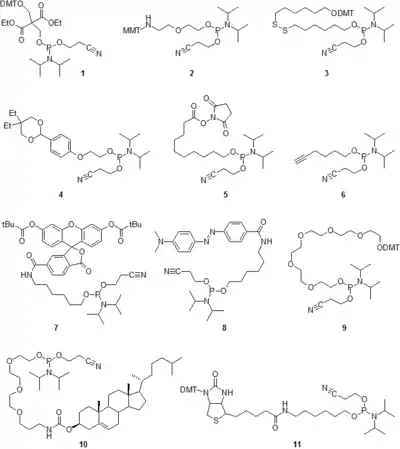 - ↑ "Beta-Cyanoethyl Phosphoramidites". Products.appliedbiosystems.com. Retrieved 2009-05-12.