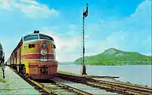 The Skytop observation cars have been described as the most distinctive railway cars ever built. The Milwaukee Road ordered several pairs of Fairbanks-Morse diesels with an orange, maroon and stainless steel exterior by Stevens. The grill/lounge and dining cars had angled seating for more interior space and a better view. The stunning trains had the Milwaukee's orange and maroon livery and green and gold seating and carpets and wood veneer with stainless steel trim. Six complete train-sets were ordered; in 1952 the first full-length dome cars, called "super domes" were added.[3] In 1957 the train was repainted into the Union Pacific Railroad’s Armour Yellow colors.