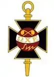 The Society's badge is a black Maltese cross background, on which is superimposed a circular crest. The crest bears the letters ΩΧΕ on a white band passing across the horizontal midline. Above the white band are two crossed retorts rendered in gold on a maroon background. Below the white band are a gold integral sign and a bolt of lightning. These symbols are noted to represent the roles of chemistry, mathematics and physics in chemical engineering.