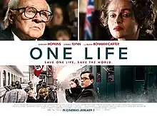 One Life is a 2023 British biographical drama film directed by James Hawes.[2] It is based on the true story of British humanitarian Sir Nicholas Winton as he looks back on his past efforts to help groups of Jewish children in German-occupied Czechoslovakia to hide and flee in 1938–39, just before the beginning of World War II. The film stars Sir Anthony Hopkins and Johnny Flynn as Sir Nicholas, with Lena Olin, Romola Garai, Alex Sharp, Sir Jonathan Pryce, and Helena Bonham Carter in supporting roles.[3]