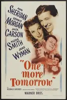 One More Tomorrow is a 1946 American drama film directed by Peter Godfrey and written by Charles Hoffman and Catherine Turney (additional dialogue by Julius J. Epstein and Philip G. Epstein) from the play The Animal Kingdom by Philip Barry. The film, starring Ann Sheridan, Dennis Morgan, Jack Carson, Alexis Smith, Jane Wyman and Reginald Gardiner. It was released by Warner Bros. on June 1, 1946. A pre-code 1932 film, The Animal Kingdom, is also based on the play.[2][3]