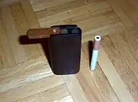 A one-hitter[1] (also oney, bat, tay, oney bat, or taster) is typically a slender pipe with a screened narrow bowl designed for a single inhalation, or "hit", of smoke or vapor from a small serving (about 25 mg) of heated cannabis flower, tobacco leaf or other dry, sifted herbal preparation.[2] It is distinguished from western-style large-bowl pipes designed for strong tobaccos that are burned hot and tasted but not inhaled. Instead, by properly distancing a lighter flame below the opening, inhalant users operate at vaporization temperatures, minimizing combustion waste and toxicity.[3][4]