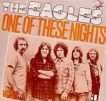 "One of These Nights" is a song written by Don Henley and Glenn Frey and recorded by the American rock band Eagles. The title track from their 1975 One of These Nights album, the song became their second single to top the Billboard Hot 100 chart after "Best of My Love" and also helped propel the album to number one. The single version was shortened from the album version of the song, removing most of the song's intro and most of its fade-out, as well. Henley is lead vocalist on the verses, while Randy Meisner sings high harmony on the refrain. The song features a guitar solo by Don Felder that is "composed of blues-based licks and sustained string bends using an unusually meaty distortion tone."[4]