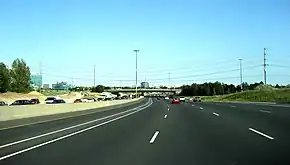 In the interim period, work went into expanding the six lane freeway through Toronto and Markham. A combination interchange was built with the new Highway 407 ETR which opened in June 1997, which as a prerequisite required the realignment of some ramps from the nearby Highway 7 interchange.[25] In early 1998, the MTO announced plans for two contracts to widen Highway 404 south of Highway 7. The first contract converted the grass median into an additional lane in each direction with a central concrete barrier between them, with the inner lanes to eventually be converted into HOV lanes. High-mast lighting was installed in the median barrier, replacing the unique luminaires that were mounted outside of the right shoulder of each direction. With the shift in road illumination completed as a prerequisite, the second contract would result in an additional lane in each direction on the outside the existing freeway south of Highway 407, making it ten lanes wide, with expansion of the southbound and northbound lanes completed in 2005 and 2007, respectively.[26][27][28] In 2002, Highway 404 was widened to six lanes between Highway 7 and Wellington Road, using the right-of-way afforded by the grass median.[6]