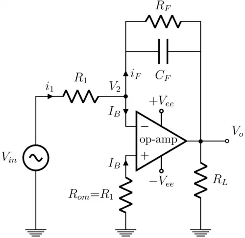Real op-amps have a finite open-loop gain, an input offset voltage and input bias currents , which may not be well-matched and may be distinguished as going into the inverting input and going into the non-inverting input. This can cause several issues for the ideal design; most importantly, if , both the output offset voltage and the input bias current can cause current to pass through the capacitor, causing the output voltage to drift over time until the op-amp saturates. Similarly, if were a signal centered about zero volts (i.e. without a DC component), no drift would be expected in an ideal circuit, but may occur in a real circuit.
