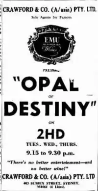 Opal of Destiny is a 1952 Australian radio serial written by Anthony Scott Veitch and directed by Tom Farley.[1]