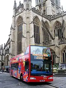 City Sightseeing tour bus in Bath, Somerset, an Optare Visionaire with Volvo chassis operated by the Bath Bus Company (outside Bath Abbey, December 2010)