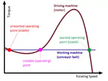 Also in case of an unstable operating point the law of the balance of the torques is always valid. But when the operating point is unstable then the characteristics of drive and machine are nearly parallel. In such a case a small change in torque will result in a big change of speed. In practice no device has a characteristics which is so thin that the intersection point can be clearly expected. Because of parallel characteristics, inner and outer friction as well as mechanical imperfections the unstable operating point is rather a band of possible operating states instead of a point. Running at an unstable operating point is therefore undesirable.