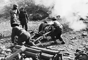 On October 30 the British fought their first action, when they became the first British Army unit to fight directly alongside communists.[1] Both the Partisans and the British gunners on the high rock shelf, 1,600 feet above the Bay, could see German movements and once the weather had cleared, heavy bombardment started. After seeing the volume and accuracy of the shelling the Germans realised that they were not dealing with the traditional Partisan fighters, but much better trained and equipped army units. Some tried to surrender to the British troops, hoping for a better treatment, but it was already agreed that all POWs were to be handed over to the Partisans.[11]