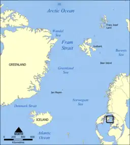 On 30 April 1942, Isbjørn and Selis (Lieutenant H. Øi Royal Norwegian Navy) and about twenty crewmen sailed from Greenock with a Norwegian landing party of 60 men, accompanied by three British liaison officers.[19] Each ship carried a 20 mm Oerlikon anti-aircraft gun but none of the party had been trained in their use. Major Amherst Whatman, a Polar explorer and signals specialist, repaired and operated the wireless set but it broke down on the journey to Iceland and was not reliable for the rest of the voyage. The ships hugged the Polar ice, with little risk of being seen by Luftwaffe aircraft, once north-east of Jan Mayen.[20] The ships reached Svalbard on 13 May and entered Isfjorden at 8:00 p.m. Grønfjorden (Green Fjord or Green Harbour to the British) was covered in ice up to 4 ft (1.2 m) thick. The ice breaking was delayed until after midnight on 14 May and parties were sent to scout Barentsburg on the east shore and the Finneset peninsula.[21] The scouting parties found no-one but took until 5:00 p.m. to get back, by when Isbjørn had cut a long channel in the ice but was still well short of Finneset. A Ju 88 flew along Isfiorden, also at 5:00 p.m. but Sverdrup insisted on making for the landing stage at Barentsburg to unload quicker.[21]