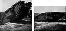 The Belgian architect who had designed the wall was a refugee in France and supplied his drawings. A replica was built at Merlimont and a detachment of tanks under Major Bingham rehearsed on it, using "shoes" on the tank tracks and special detachable steel ramps carried by the tanks, until they could climb the wall.[7] In experiments on the Thames Estuary, the pontoons performed exceptionally well, riding out very bad weather and being easier to manoeuvre than expected, leading to hopes that they could be used again after the initial assault to land reinforcements.[8] Night landings were also practised, with wire stretched between buoys to guide the pontoons to within 100 yd (91 m) of their landing place.[6]