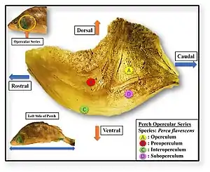 Opercular series in bony fish: operculum (yellow), preoperculum (red), interoperculum (green) and suboperculum (pink)
