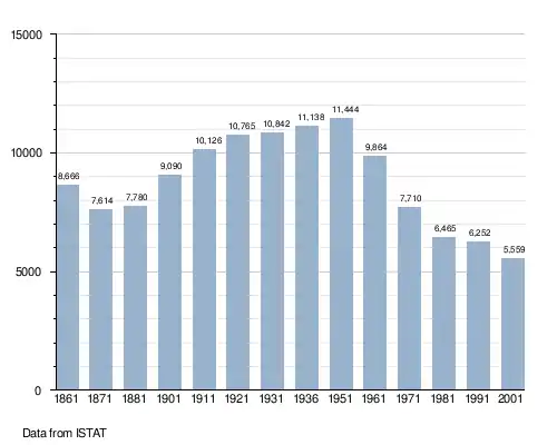 The population halved during the last century. Many inhabitants moved to the industrial centres in northern Italy or joined the Italian diaspora to escape the extreme poverty.[4]