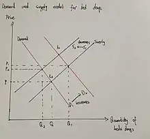 However, the opportunity cost of implementing policies to the sector has limited impact in the health sector. Patients with severe symptoms of COVID-19 require close monitoring in the ICU and in therapeutic ventilator support, which is key to treating the disease.[27] In this case, scarce resources include bed days, ventilation time, and therapeutic equipment. Temporary excess demand for hospital beds from patients exceeds the number of bed days provided by the health system. The increased demand for days in bed is due to the fact that infected hospitalized patients stay in bed longer, shifting the demand curve to the right (see curve D2 in Graph1.11).[25] The number of bed days provided by the health system may be temporarily reduced as there may be a shortage of beds due to the widespread spread of the virus. If this situation becomes unmanageable, supply decreases and the supply curve shifts to the left (curve S2 in Graph1.11).[25] A perfect competition model can be used to express the concept of opportunity cost in the health sector.[28] In perfect competition, market equilibrium is understood as the point where supply and demand are exactly the same (points P and Q in Graph1.11).[25] The balance is Pareto optimal equals marginal opportunity cost. Medical allocation may result in some people being better off and others worse off. At this point, it is assumed that the market has produced the maximum outcome associated with the Pareto partial order.[25] As a result, the opportunity cost increases when other patients cannot be admitted to the ICU due to a shortage of beds.