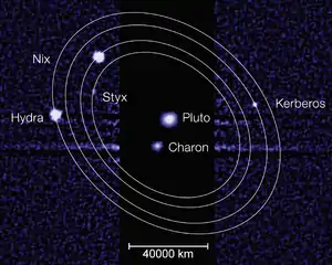 Diagram of the orbits of Pluto's small outer four moons, which follow a 3:4:5:6 sequence of near resonances relative to the period of its large inner satellite Charon. The moons Styx, Nix and Hydra are also involved in a true 3-body resonance.