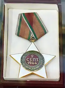 The Order of 9 September 1944 was an Order of Merit of the Kingdom of Bulgaria from 1945 to 1946, and of the People's Republic of Bulgaria from 1946 to 1990. It commemorated the Bulgarian coup d'état of 1944, it came in three classes, had both a civil and military division and was awarded for services connected with the Army revolt of 9 September 1944 and the formation of the People's Republic, to civilians for service to the government and in wartime to officers and leaders of the People's Army for courage and leadership.