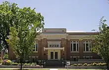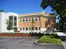 The Beaux Arts style brick structure includes a portico on the State Street entrance on the north side.[4][5] The façade includes an inscription, "PUBLIC LIBRARY", in Roman type over the entryway, which is sheltered by a rigid metal awning on this north front.[5] The roof of the square-shaped structure is constructed of both metal and tile.[15] Stone is used for architectural accents of lintels and cornices on the exterior.[15] The building remains connected to the neighboring former offices of the YWCA, which is a Pietro Belluschi designed building also owned by Willamette University.[16]