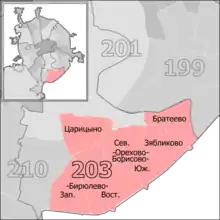 | Districts | Southern AO (Biryulyovo Vostochnoye, Biryulyovo Zapadnoye, Brateyevo, Orekhovo-Borisovo Severnoye, Orekhovo-Borisovo Yuzhnoye, Tsaritsyno, Zyablikovo)[1] |