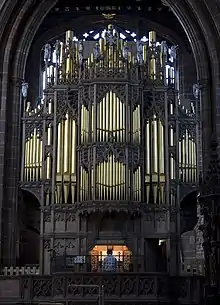 In 1844, an organ by Gray & Davison of London was installed in the cathedral, replacing an instrument with parts dating back to 1626, possibly by Father Smith. The organ was rebuilt and enlarged by Whiteley Bros. of Chester in 1876, to include harmonic flutes and reeds by Cavaillé-Coll. It was later moved to its present position at the front of the north transept. In 1910 William Hill and Son of London extensively rebuilt and revoiced the organ, replacing the Cavaillé-Coll reeds with new pipes of their own. The choir division of the organ was enlarged and moved behind the choirstalls on the south side. The instrument was again overhauled by Rushworth and Dreaper of Liverpool in 1969, when a new mechanism and some new pipework made to a design by the organist, Roger Fisher, was installed. Since 1991 the organ has been in the care of David Wells of Liverpool.[4] The organ case is by Sir Gilbert Scott.[5]
