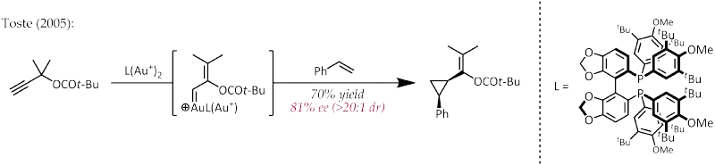 Relativistic effects are significant in organogold chemistry due to the large nuclear charge of the metal (Z = 79). As a consequence of relativistically expanded 5d orbitals, the LAu fragment can stabilize a neighboring carbocation via electron donation into the empty p-type orbital. Thus, in addition to their expected carbocation-like reactivity, these cations also exhibit significant carbene character, a property that has been exploited in catalytic transformations such as cyclopropanation and C-H insertion.[22] Propargyl esters can serve as precursors for cationic gold-vinylcarbene intermediates, which can react with alkenes in a concerted manner to afford the cyclopropanation product. The use of a chiral ligand ((R)-DTBM-SEGPHOS) resulted in good to excellent levels of enantioselectivity.[23]