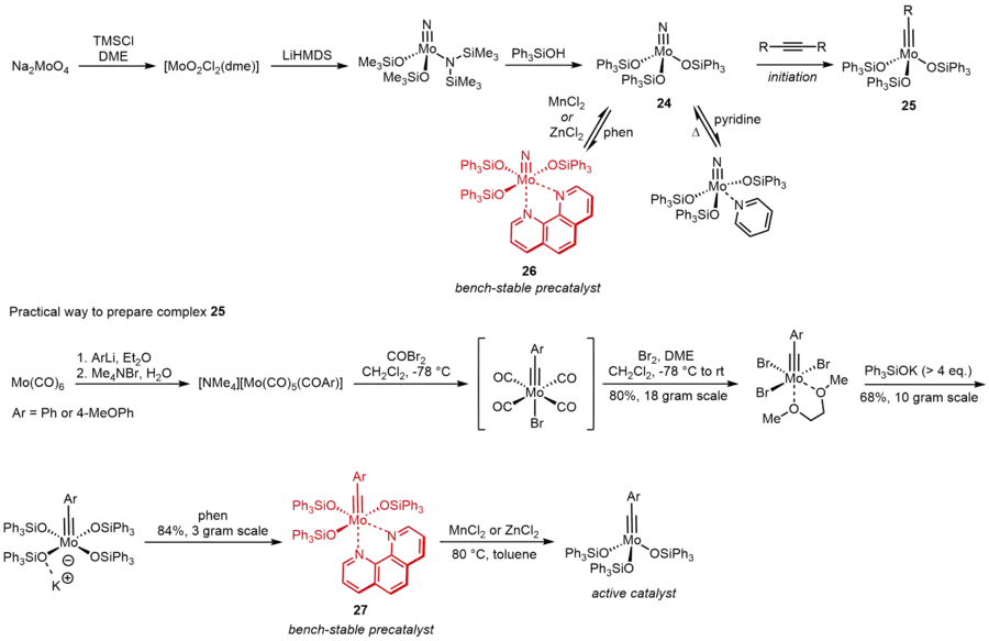 Molybdenum nitride complexes with Ph3SiO ligands are practical and tolerant precatalyst for alkyne metathesis.[19] This result implied that molybdenum alkylidynes endowed with Ph3SiO ligands must be very active. To further increase the feasibility, stability and activity of these catalysts, they came up with an independent route to directly prepare the alkylidynes instead of their nitrile counterparts. By complexation with 1,10-phenanthroline, an air-stable compound 27 can be formed as precatalyst, which can be activated easily by MnCl2 or ZnCl2 in solvents.[20] As shown below, this route is highly scalable and practical.
