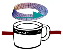 In this situation, a spinor is a sort of polarized vector. In the adjacent diagram, a spinor can be represented as a vector whose head is a flag lying on one side of a Möbius strip, pointing inward. Initially, suppose that the flag is on top of the strip as shown. As the coffee cup is rotated it carries the spinor, and its flag, along the strip. If the cup is rotated through 360°, the spinor returns to the initial position, but the flag is now underneath the strip, pointing outward. It takes another 360° rotation in order to return the flag to its original orientation.