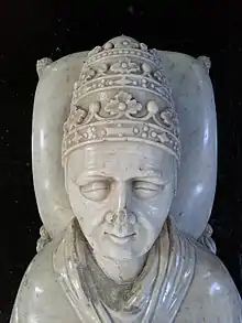 The Extultet Barberini, dated around 1087, shows an early version of the tiara, with lower band and a crosshatch pattern on the conical tiara.[3][4] A similar tiara is shown on Innocent III in a fresco at Sacro Speco from about 1219 and on a mosaic from Old Saint Peter's, now in the Museo di Roma.[5] A similar tiara, conical and with only one crown at the base, is seen worn by pope Clement IV in frescoes from the 13th century in Pernes-les-Fontaines, France and at his tomb in Viterbo. Also in Viterbo is the tomb of Hadrian V by Arnolfo di Cambio, with a similar tiara. The tomb of Honorius IV in Santa Maria in Ara Coeli also presents the tiara with one crown with gems at the bottom and topped with a large gem.[6] The tomb of Gregory X (1271–1276) shows him wearing a similar tiara, with the base a full crown and a textured and decorated conical body.[4][7] A fresco by Buffalmacco in the Arezzo cathedral depicts Gregory X wearing a similar tiara with black lappets.