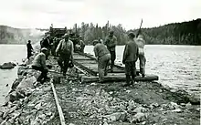 The section from Orivesi to Jämsä was ordered to be built in 1938.[2] The approval was influenced by Rudolf Walden, who promised that the Yhtyneet Paperitehtaat (now UPM-Kymmene) factories would contribute towards covering the costs.[3] Construction began in 1939 and continued during the war years, partly with labour from prisoners of war. The 56 kilometres (35 mi) long line to Jämsä was completed in 1950 and the extension to the Jämsänkoski mills, the costs of which were split half and half between the state and Yhtyneet Paperitehtaat, followed in 1951. The line from Jämsä to Olkkola on the shore of lake Päijänne was completed in 1953.[2] On average, 300 people worked on the line each year, peaking at over 700 at times. The line demanded the construction of numerous bridges, curves and embankments, thanks to the complicated terrain it passes through.[3] The railway and its branches were needed to transport raw wood from the Päijänne area, as well as products of the growing wood processing industry in the Jämsänjoki valley. Partly thanks to the railway, the Jämsänkoski paper mill later became accompanied by another in Kaipola, as well as a sawmill in Olkkola. The sidings also served passenger traffic. The volume of traffic, peaking in the mid-1960s, quickly collapsed by the end of the decade and passenger services were discontinued in 1969. By the 1970s, the line's traffic dwindled to a few freight trains a day.[2]