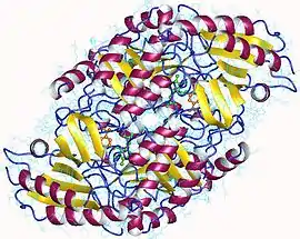 - 1 2 Shen BW, Hennig M, Hohenester E, Jansonius JN, Schirmer T (1998). "Crystal structure of human recombinant ornithine aminotransferase". J. Mol. Biol. 277 (1): 81–102. doi:10.1006/jmbi.1997.1583. PMID 9514741.