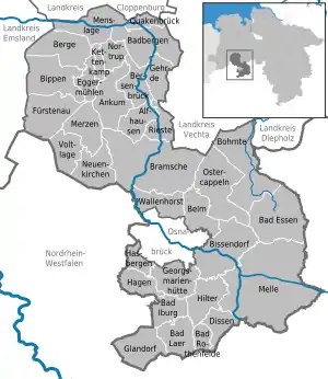 Osnabrück (German: [ɔsnaˈbʁʏk] ⓘ) is a district (Landkreis) in the southwest of Lower Saxony, Germany. With 2,122 km² it is the second largest district of Lower Saxony.