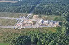 Despite massive citizen protests, the Cologne City Council decided in 2008 to build 640 residential units, 400 of which were to be integrated into apartment buildings. The citizens of Ostheim feared that the technical and social infrastructure of the district would not allow an influx of approximately 2,000 new citizens.[29] After several citizen hearings, the city of Cologne changed the development plan so that the foundation stone could be laid in the fall of 2012. The first apartment buildings were ready for occupancy in spring 2014. By 2018, 450 rental units, some of them subsidized with public funds, are to be built in mostly three-story apartment buildings, as well as up to 240 owner-occupied homes. Almost all streets were named after women who had a connection to the former state of Baden. The access road to the new development bears the name of the former Kalk district chairman Hans Offermann.[30][31][32][33]