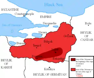 Osman's origins are extremely obscure, and almost nothing is known about his career before the beginning of the fourteenth century.[43] The date of 1299 is frequently given as the beginning of his reign, however this date does not correspond with any historical event, and is purely symbolic.[44] By 1300 he had become the leader of a group of Turkish pastoral tribes, through which he ruled over a small territory around the town of Söğüt in the north-western Anatolian region of Bithynia. He led frequent raids against the neighboring Byzantine Empire. Success attracted warriors to his following, particularly after his victory over a Byzantine army in the Battle of Bapheus in 1301 or 1302.[45] Osman's military activity was largely limited to raiding because, by the time of his death, in 1323-4, the Ottomans had not yet developed effective techniques for siege warfare.[46] Although he is famous for his raids against the Byzantines, Osman also had many military confrontations with Tatar groups and with the neighboring principality of Germiyan.[47]