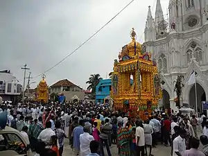 The culmination of the feast is the golden chariot procession: two golden chariots are taken on the 9th and 10th days of the feasts. Our Lady of Delight is taken in procession in the 1st chariot, which was made in 1798. St. Joseph, the spouse of Mary, is taken in procession in the 2nd chariot, which was made in 1833. During the golden chariot procession, the traditional Nathaswaram music and peculiar praising of Mother Mary by an art of pala padal can be heard and seen. Pilgrims from different parts of the country visit the church during the annual feast.