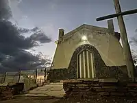 The reputation of the gold deposits on the margins of the Peixe River brought many adventurers to the Chapel of Rio do Peixe region who were responsible for building the Chapel of Saint Anne that, besides being the patron saint, was considered the owner of the place, showing the presence of Catholicism in a landscape where the houses or ranches were simple and small, made of wattle and daub technique, adobe, with a roof of buriti leaves with a ground floor, of one or two pitches and single storey.[22] The current one, the third one built, is located at the top of a square, a natural grassed elevated area, and has a facade with characteristics of the colonial period, formerly whitewashed and with turquoise blue frames, in a style that, at first, doesn't distinguish it from many others scattered throughout the recesses that sheltered populations in the Brazilian colonial period, and brings with it traits very characteristic of this period, such as having the local cemetery attached, being a great place of pilgrimage to the festivities celebrated there in July. In the mid-1980s, under the tutelage of the Goianésia Parish, the current temple underwent internal transformations, such as the removal of the original wood floor for a masonry and ceramic floor and lining with a plasterboard structure; two other rooms were added to the temple, one for the sacristy and the other to serve as the priests' dormitory during the festivities.[22]