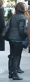 Over the next three decades, the popularity of over-the-knee boots as a fashion item for women waxed and waned. In the early 1970s, the multi-colored suede and canvas over-the-knee boots produced by the London store Biba[19] were so sought-after that queues would form outside the store when a delivery was due.[20] The end of the decade saw a second-wave of over-the-knee and thigh-length boots; these were a longer version of the stack-heeled knee-length boots popular in the late 1970s and were usually worn over jeans.[21][22] In the late 1980s, over-the-knee boots made a reappearance; these were loose-fitting, low-heeled styles in suede,[23] often brightly colored or decorated with brocade.[24] By 1990, Karl Lagerfeld had included thigh-length satin boots in his Fall/Winter Couture collection for Chanel, using the boots as an alternative to leggings;[25] there was a brief vogue for thigh-length "riding boots” in the early 1990s[26] and over-the-knee styles were intermittently popular throughout the first decade of the 21st century. In 2009, thigh-length boots were a subject of major attention by the fashion press,[27][28][29][30][31][32] receiving guarded approval and a level of mainstream acceptance that they had never previously achieved; this trend continued in 2010[33][34][35] and by the following year, over-the-knee styles had become commonplace.