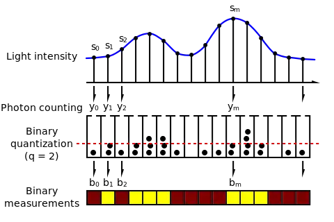 Fig.2 illustrates the binary sensor model. The denote the exposure values accumulated by the sensor pixels. Depending on the local values of , each pixel (depicted as "buckets" in the figure) collects a different number of photons hitting on its surface. is the number of photons impinging on the surface of the th pixel during an exposure period. The relation between and the photon count is stochastic. More specifically, can be modeled as realizations of a Poisson random variable, whose intensity parameter is equal to ,