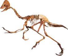 Oviraptorosaurs ("egg thief lizards") are a group of feathered maniraptoran dinosaurs from the Cretaceous Period of what are now Asia and North America. They are distinct for their characteristically short, beaked, parrot-like skulls, with or without bony crests atop the head. They ranged in size from Caudipteryx, which was the size of a turkey, to the 8-meter-long, 1.4-ton Gigantoraptor.[4] The group (along with all maniraptoran dinosaurs) is close to the ancestry of birds. Some researchers such as Maryanska et al (2002) and Osmólska et al. (2004) have proposed that they may represent primitive flightless birds.[5][6] The most complete oviraptorosaur specimens have been found in Asia.[7] The North American oviraptorosaur record is sparse.[7]